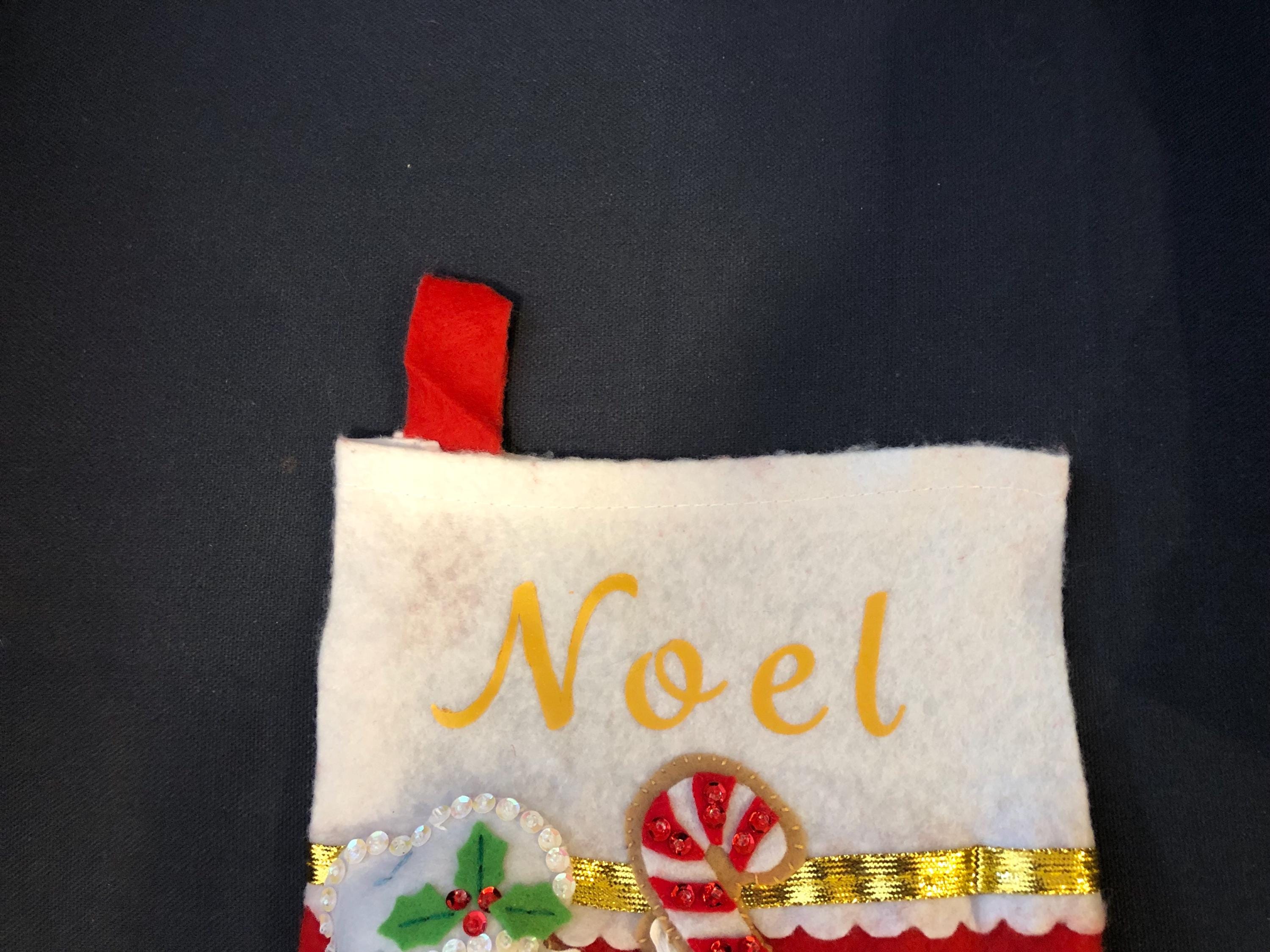 Hand crafted Holiday/Christmas Stocking made in New Jersey, from a felt kit. All the items are hand cut, hand sewn and hand detailed with sequins and beads, plus lightly stuffed for a three dimensional look. One of a kind item and a great “First Christmas” or pet gift with the option for personalization with any name up to 8 letters. (Bow not included)