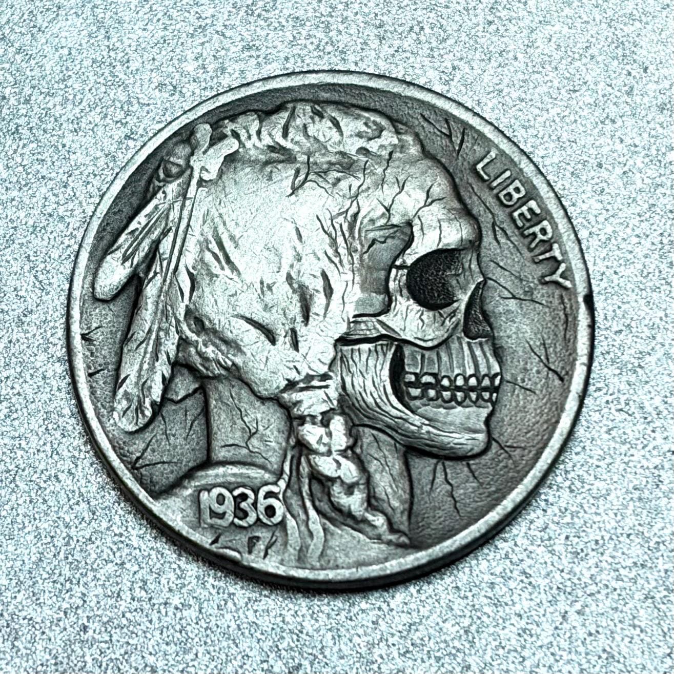 This is a Made to Order Hobo Nickel Skull. The Skull you will receive will be similar to the one pictured. Please keep in mind that these are hand carved by Life member of the Hobo Nickel Society, and are one of a kind. Every coin I carve is initialed and numbered. No two skulls will be alike. A truly original piece of art. Date chosen at random. Coin is signed/initialed and numbered by the artist.