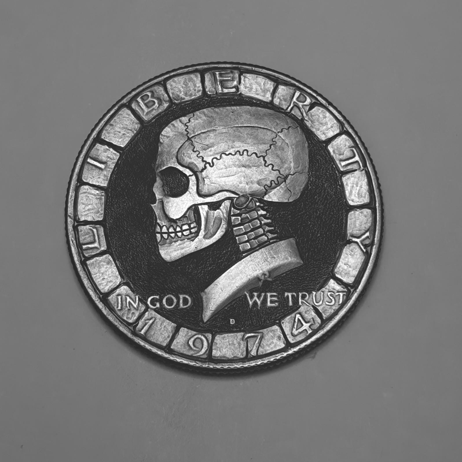 This is a Made to Order Hobo Nickel Skull carved on a John F Kennedy Half Dollar. The Skull you will receive will be similar to the one pictured. Please keep in mind that these are hand carved and one of a kind. No two skulls will be alike. Date will vary. Specific dates can be requested in advance. A truly unique piece of art. Coin is signed/initialed and numbered by the artist.