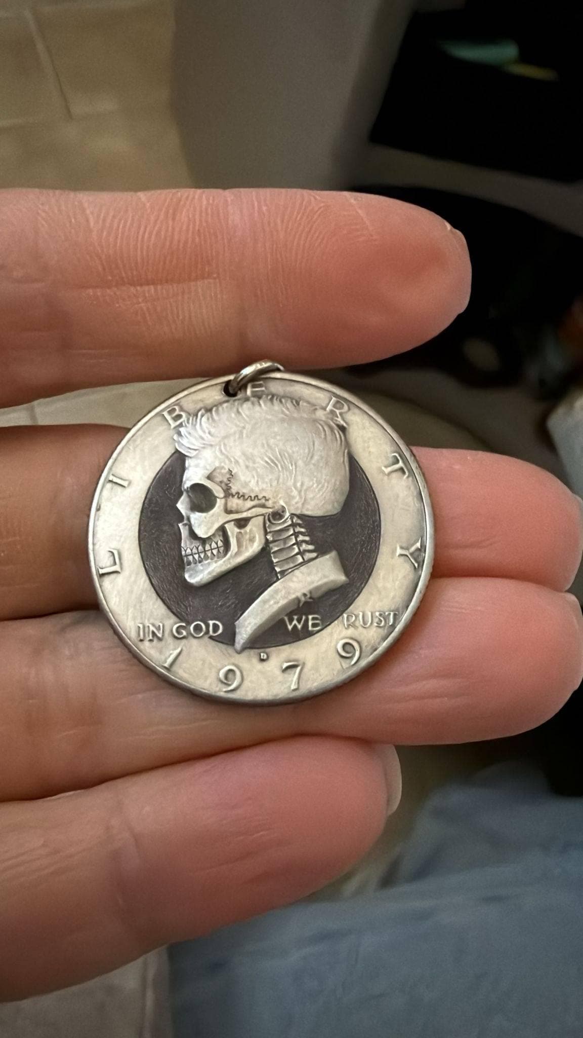 This is a Made to Order Hobo Nickel Skull carved on an authentic U.S. John F Kennedy Half Dollar. The Skull you will receive will be similar to the one pictured. Please keep in mind that these are hand carved and one of a kind. No two skulls will be alike. Date will vary. Specific dates can be requested in advance. A truly unique piece of art. Coin is signed/initialed and numbered by the artist.