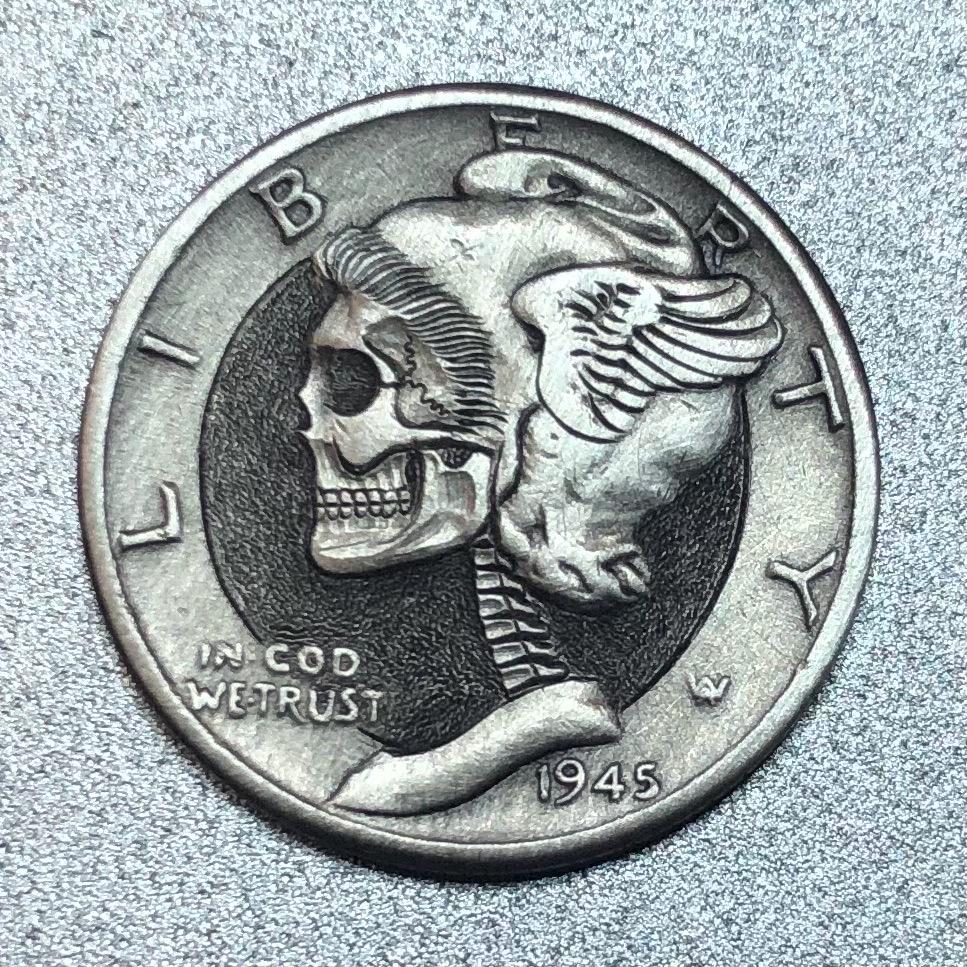 This is a Made to Order Hobo Nickel Skull carved on an authentic U.S. Mercury 90% Silver Dime. The Skull you will receive will be similar to the one pictured. Please keep in mind that these are hand carved and one of a kind. No two skulls will be alike. Date will vary. Specific dates can be requested in advance. A truly unique piece of art. Coin is signed/initialed and numbered by the artist.