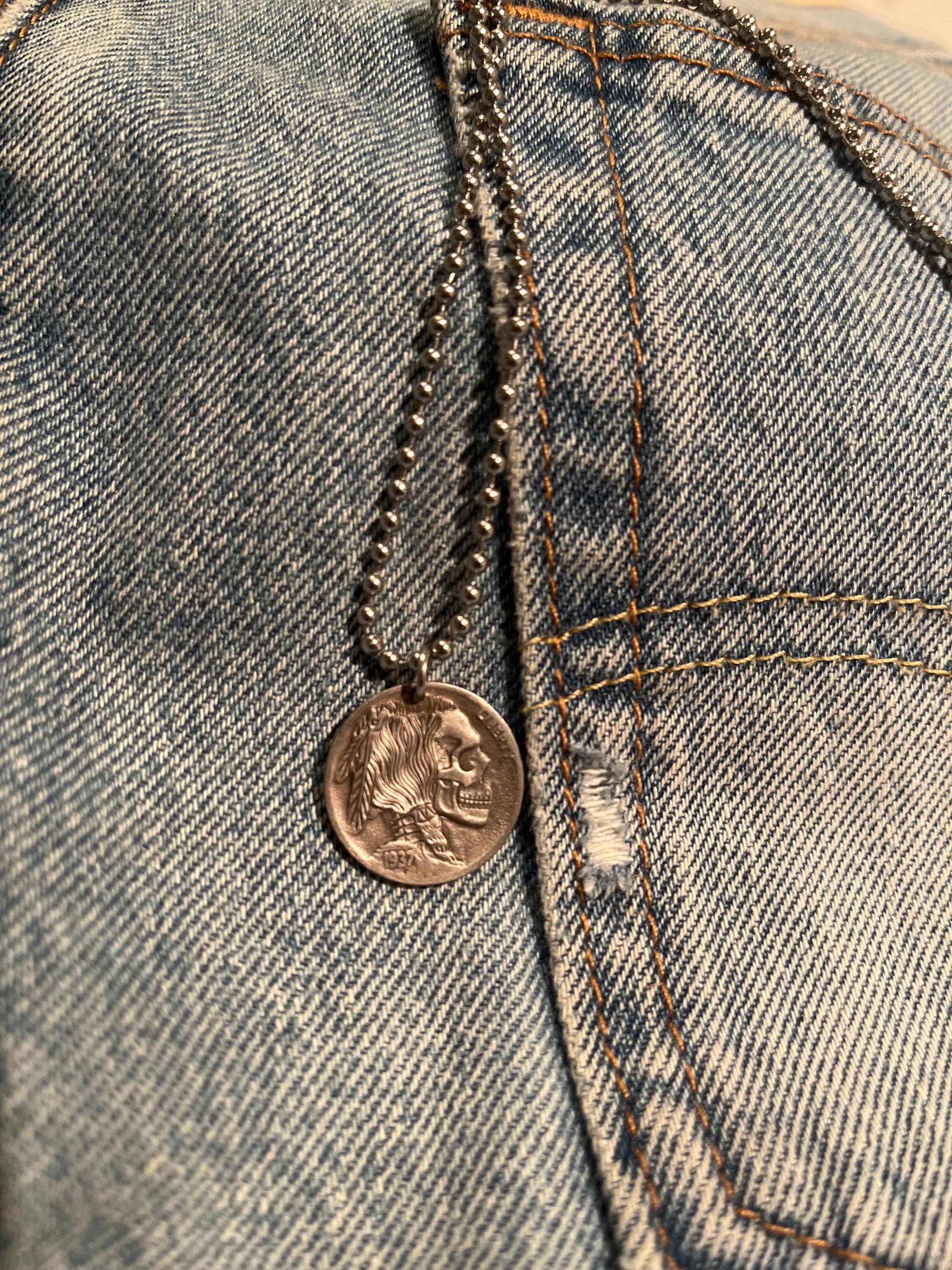 This is a Made to Order Hobo Nickel Skull. The Skull you will receive will be similar to the one pictured. Please keep in mind that these are hand carved and one of a kind. No two skulls will be alike. A truly unique piece of art. Chain will be sized at buyers request. Date chosen at random. Coin is signed/initialed and numbered by the artist.