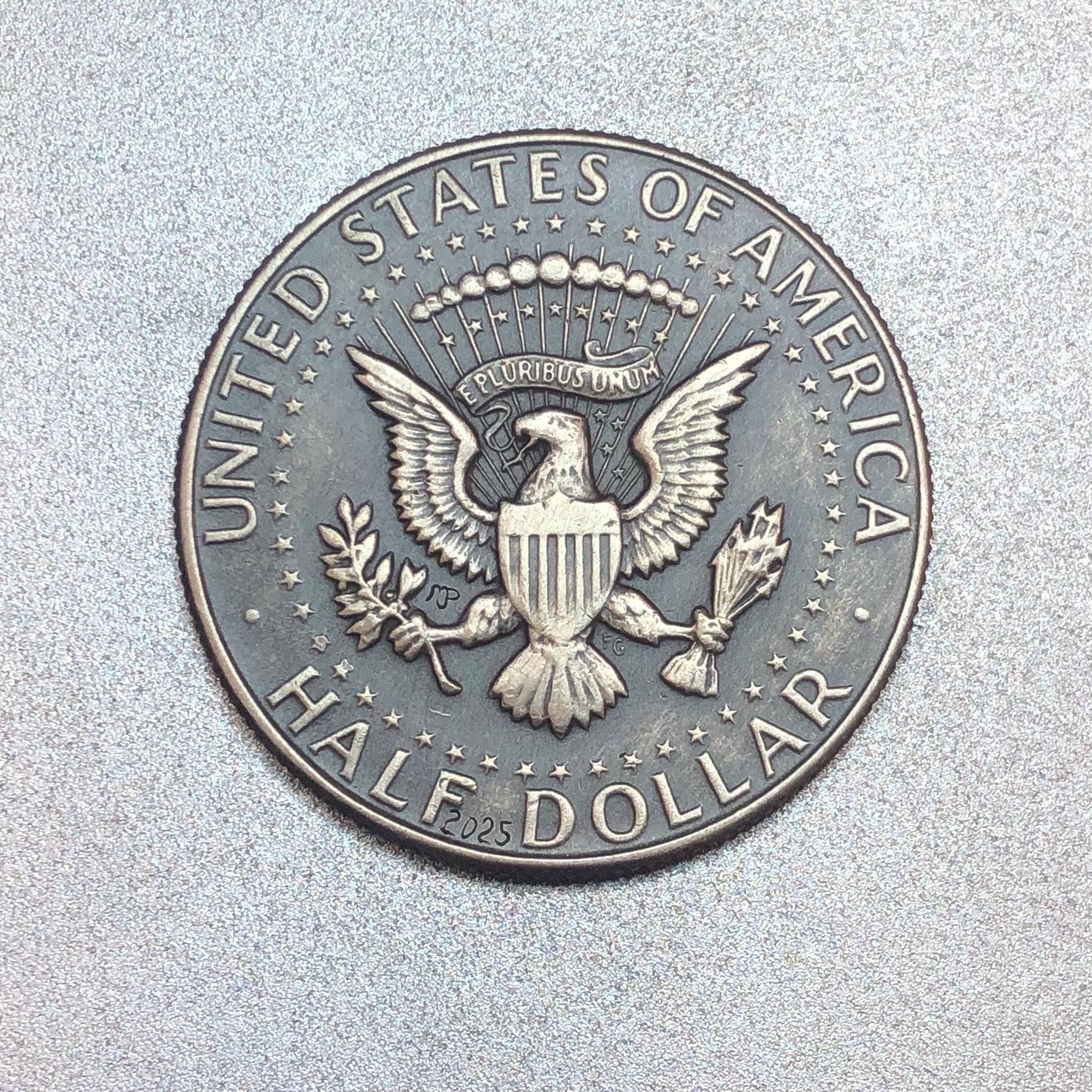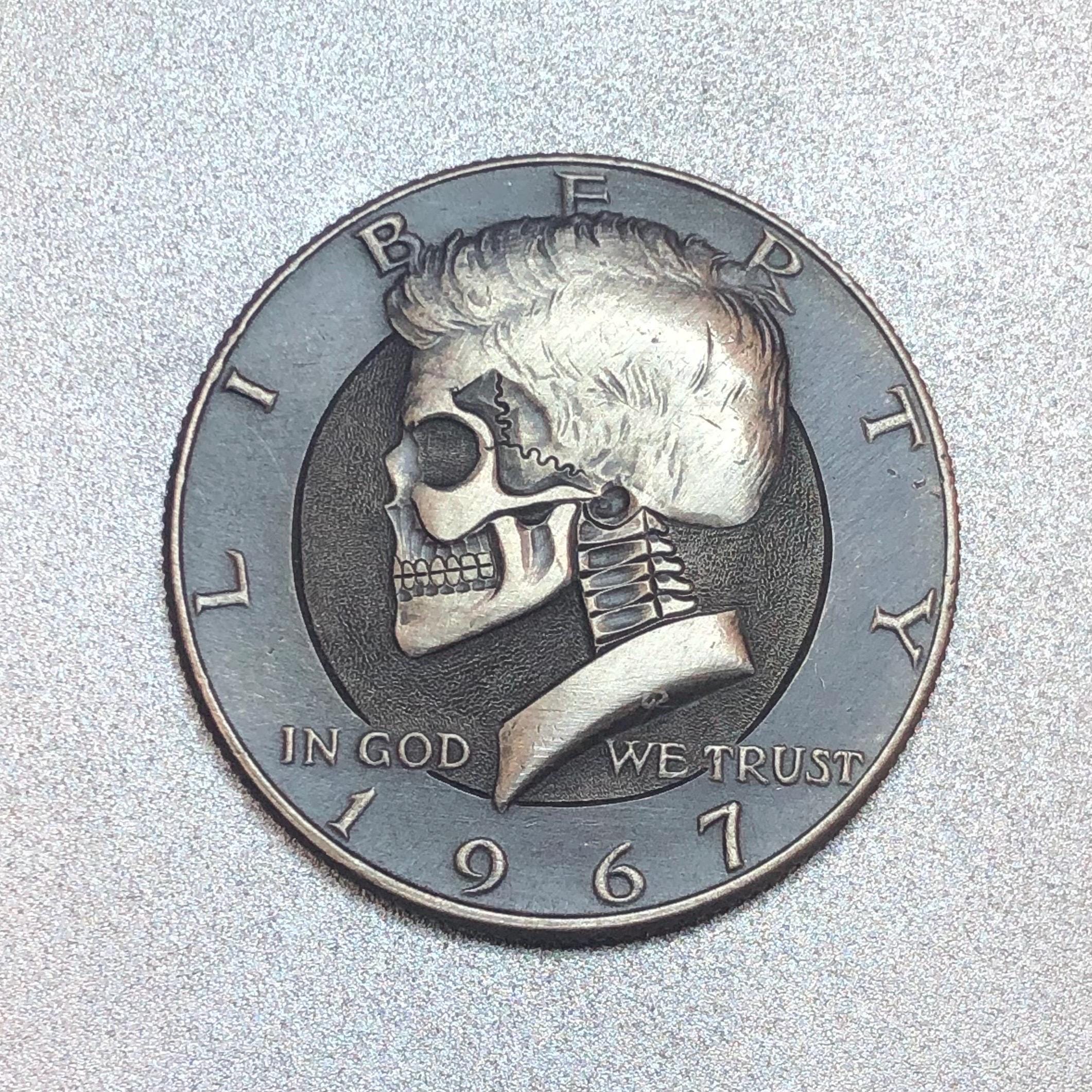 This is a Made to Order Hobo Nickel Skull carved on an authentic U.S. John F Kennedy Half Dollar. The Skull you will receive will be similar to the one pictured. Please keep in mind that these are hand carved and one of a kind. No two skulls will be alike. Date will vary. Specific dates can be requested in advance. A truly unique piece of art.